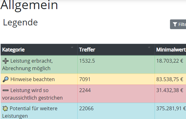 Das Herzstück von HonorarPlus. Ihre Abrechnung wird mit über 6500 Prüfalgorithmen geprüft und Sie sehen auf einen Blick welche Leistungen noch abrechenbar sind und welche Leistungen seitens der KV voraussichtlich gestrichen werden.